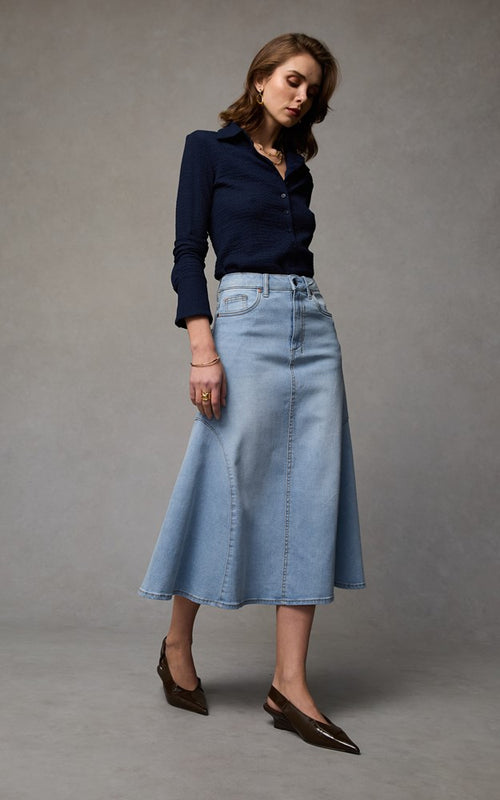 A modern touch to a vintage silhouette, the Abby denim skirt is crafted in a light blue wash. Cut from structured yet comfortable premium stretch denim, it sits high on the waist before flaring out into a voluminous A-line shape. A versatile staple with a bold, feminine edge.