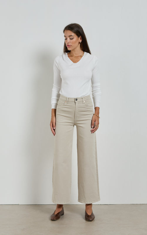 Designed to make a statement, these super high-rise jeans offer a dramatic silhouette that elongates the frame and defines the waist. Cut from structured stretch denim with just the right amount of softness, they fall into exaggerated wide legs that move with a sculptural grace.