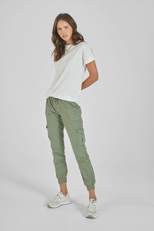 Cargo Green Pants boast a comfortable mid-rise relaxed fit, with a ribbed waistband and sporty drawstring. Made from soft Tencel Fabric, they feature a slanted front and flap cargo pockets, with an ankle-length and cuffed bottom hem.