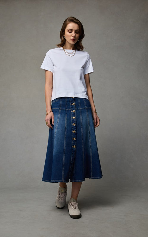 In a luminous Pacific-blue wash, the Gabby Flare Skirt shapes your silhouette with a high waistband that skims the hips before sweeping into a fluid, flared hem. Its subtly tailored panelling creates soft volume and movement, an artful essential that pairs beautifully with crisp tees or sleek knitwear.