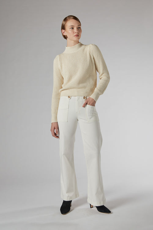 This turtleneck Hildy Cotton Top is loosely spun with 100% Cotton yarn. A versatile sweater that fits loose on the body with a fitted ribbed cuff at the bottom hem and sleeves.