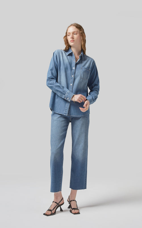 Jayda is a regular fit denim shirt, cut from premium 100% Cotton Denim. Designed with one chest pocket and contrast stitching details.