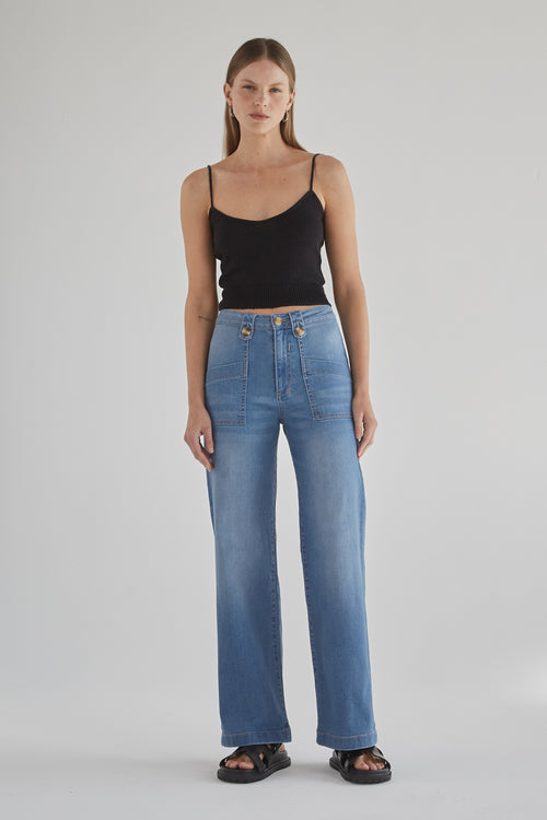 The Marcia Knit Tank is made of a linen blend fabric and features a crop top design with adjustable straps. The waist hem is neatly knit in and adorned with a broader rib knit, while the clean drop neckline adds a touch of sophistication.