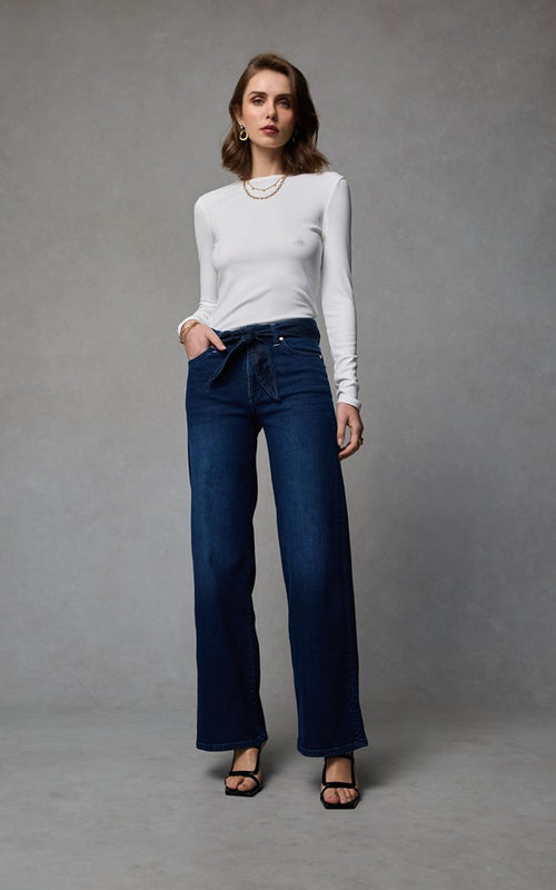 The Molly Mid-Rise Straight Leg Jeans are cut from soft stretch denim in a clean wash, offering a timeless silhouette with effortless appeal. A bandana detail at the waistband adds a playful, unexpected twist to this refined everyday staple.
