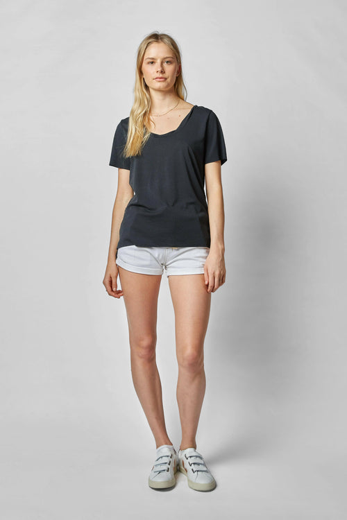 Nova Leopard Print Modal Loose Tee features a soft modal knit fabric with a subtle leopard print. It has a relaxed fit with a slightly longer back and a raw hem, complemented by twisted neck details and a side slit.