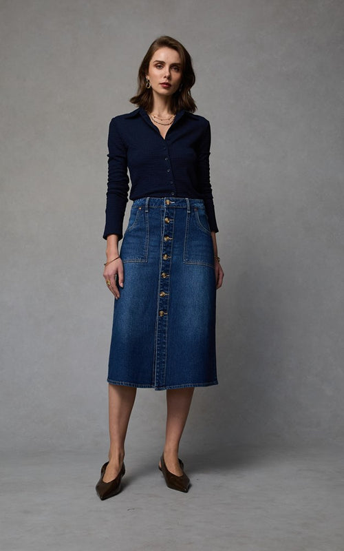 Cut from pacific blue stretch denim, this midi denim skirt channels utilitarian charm with refined ease. The front is detailed with a buttoned placket, lending a structured yet fluid shape that flatters the waist and flares gently to the hem.