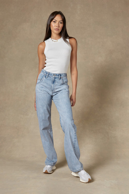 The Seville jeans have a high-rise cut, a half-back elasticated waistband, and a straight-leg shape, making them perfect for a casual weekend day in the city. These denim jeans are easy to style.