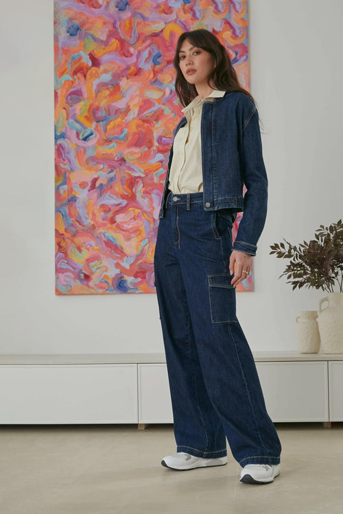 Our signature Walker Roxy Jacket in dark indigo is crafted in stretch denim. This bomber jacket is paired with dark indigo jeans for a tone-on-tone look.
