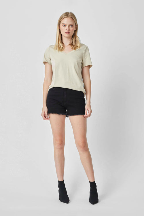 Meet Yenny, a V-neck tee with an asymmetrical bottom seam and raw hem. This relaxed fit design is crafted from premium combed cotton.