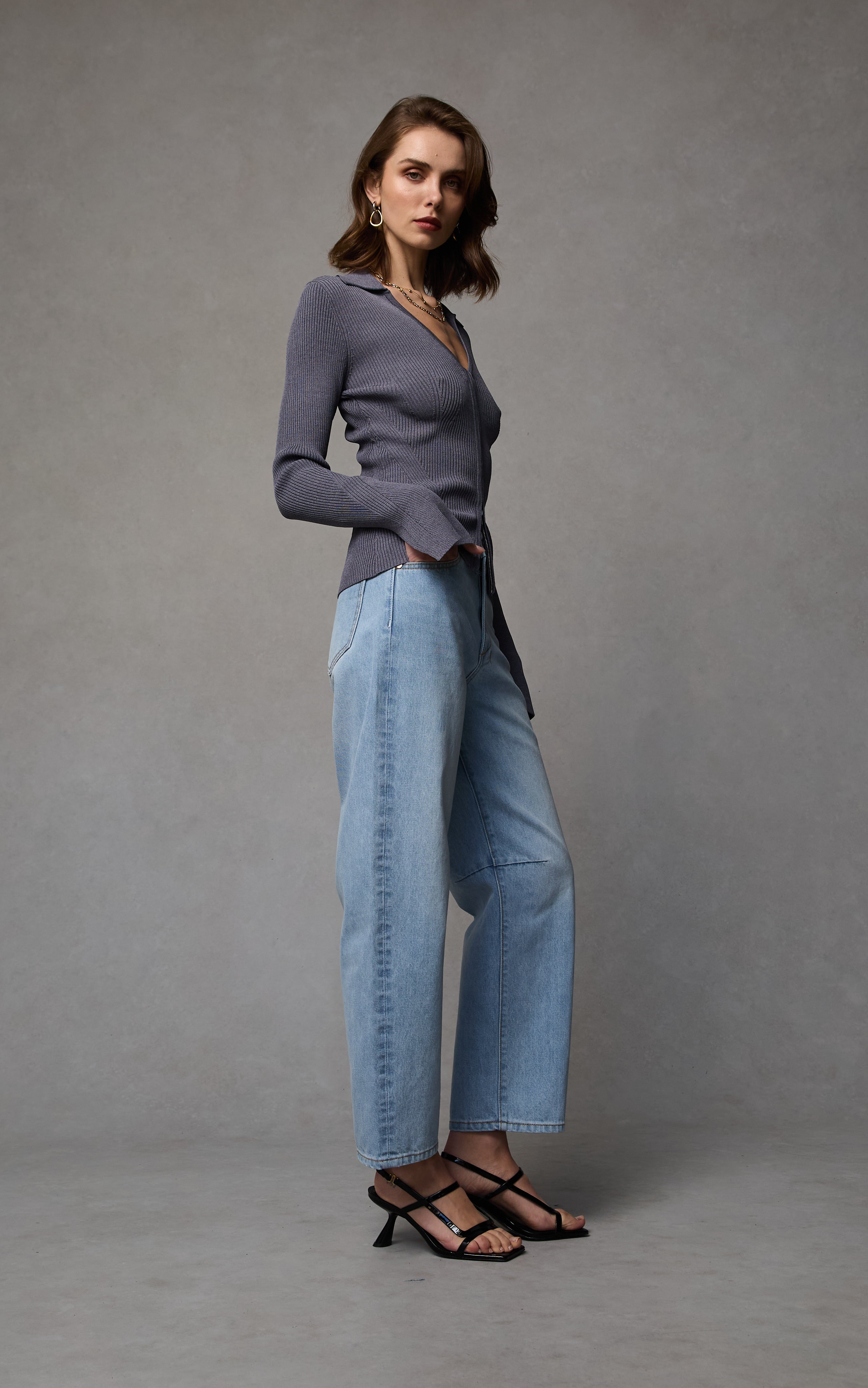 Effortlessly cool in a rich light‚blue wash, the Dina Cropped Barrel‚ Leg Jeans offer a high-rise waist that beautifully balances volume through the thigh before tapering at the cropped hem. With clean five pocket styling and precision tailoring, they elevate everyday denim with a sculptural, fashion-forward edge.