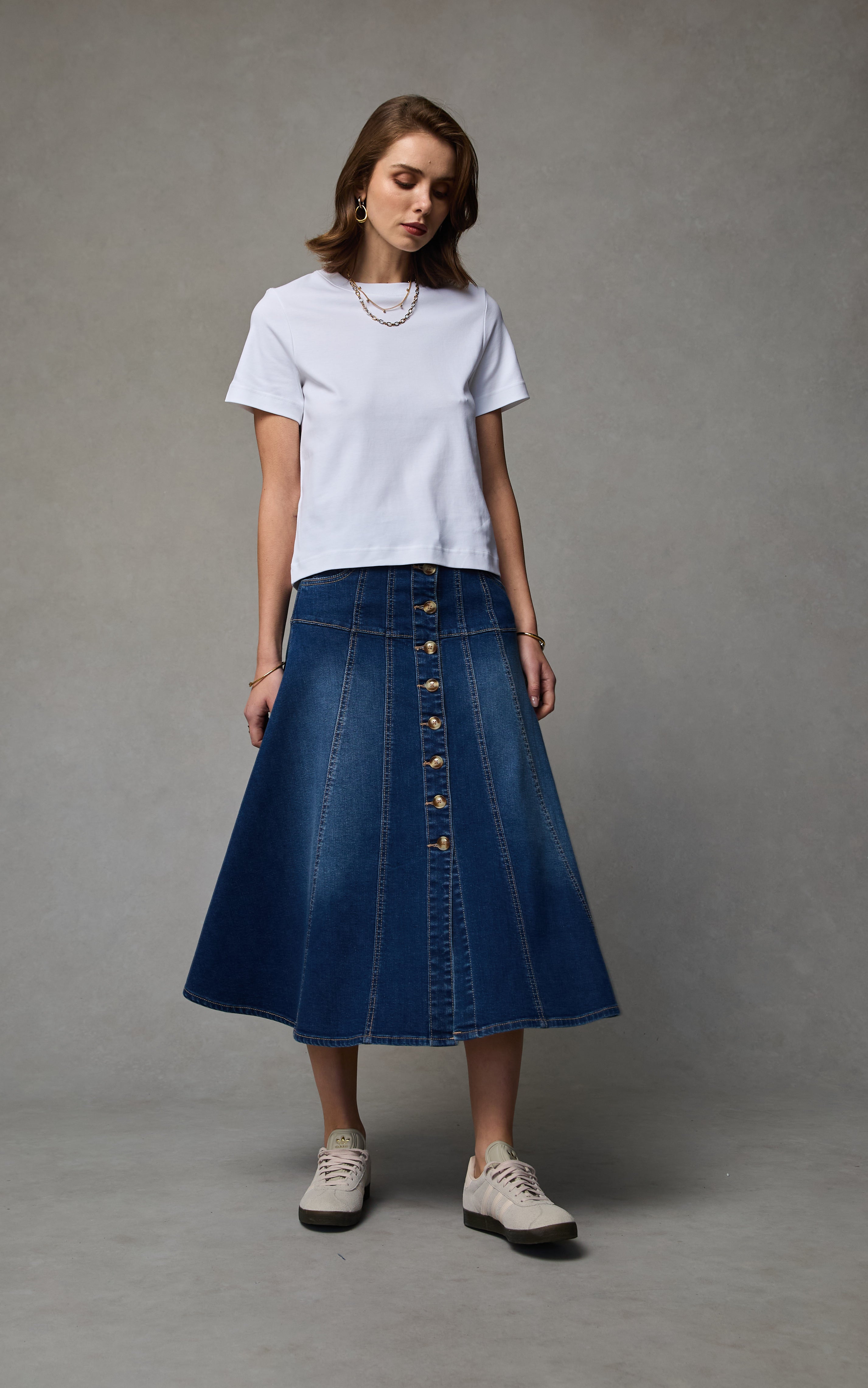 In a luminous Pacific-blue wash, the Gabby Flare Skirt shapes your silhouette with a high waistband that skims the hips before sweeping into a fluid, flared hem. Its subtly tailored panelling creates soft volume and movement, an artful essential that pairs beautifully with crisp tees or sleek knitwear.