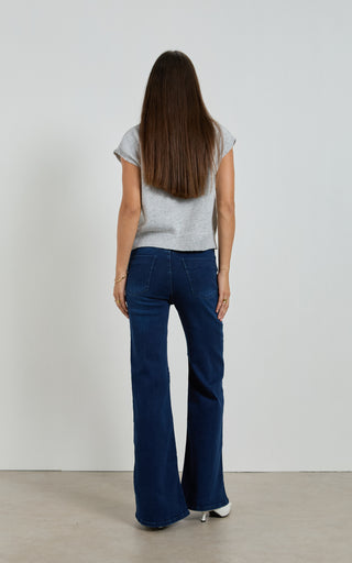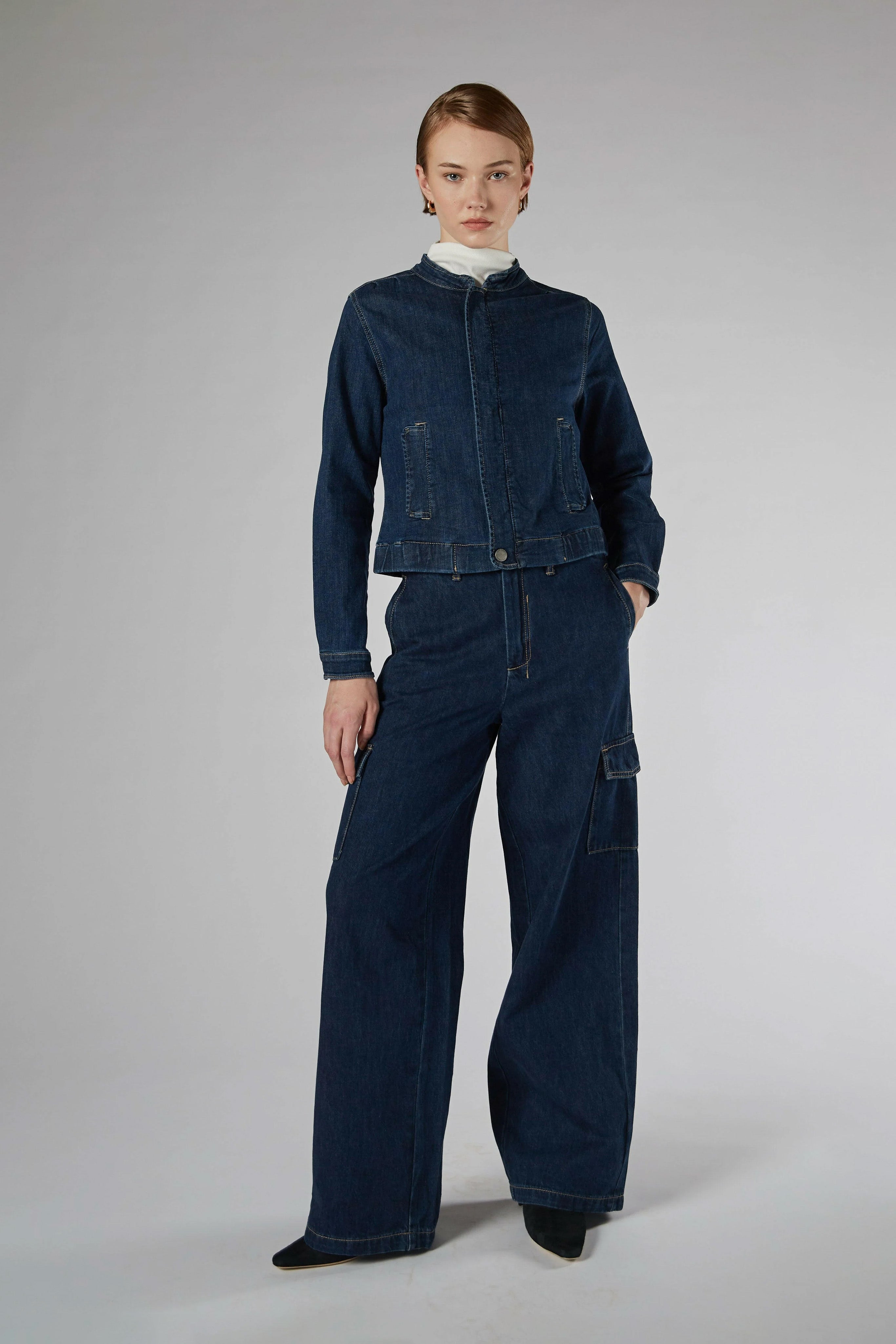 Our signature Walker Roxy Jacket in dark indigo is crafted in stretch denim. This bomber jacket is paired with dark indigo jeans for a tone-on-tone look.